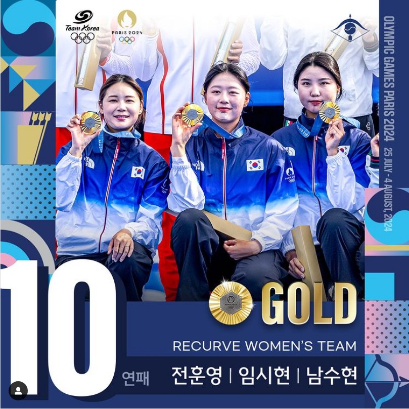 파리올림픽 양궁 여자 단체 금메달을 따면서 올림픽 10연패의 놀라운 기록을 달성하였습니다.