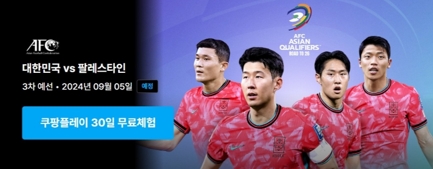 2024 북중미 월드컵 3차예선 경기 중계 보는 법 알려드립니다. 1차전 팔레스타인전 중계는 TV는 SBS로 OTT 서비스 쿠팡 플레이를 통해 시청하실 수 있습니다. 쿠팡 플레이는 쿠팡 와우 회원이라면 모두 무료로 시청 가능합니다. 아직 회원이 아니시라면 30일 동안 무료 시청 가능한 쿠폰이 제공됩니다.