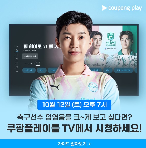축구 선수로 변한 임영웅을 크게 보고 싶지 않으세요? 쿠팡플레이 TV로 보실 수 있습니다.