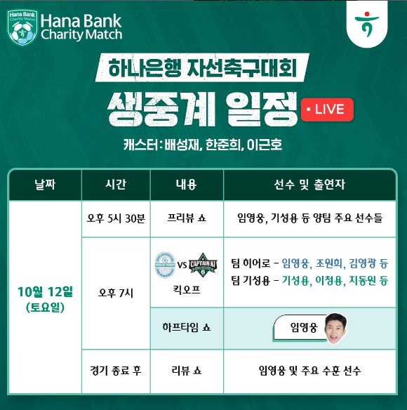 팀 히어로 VS 팀 기성용의 경기와 전반전이 끝난 후 선보이는 임영웅의 하프타임 쇼가 펼쳐집니다.