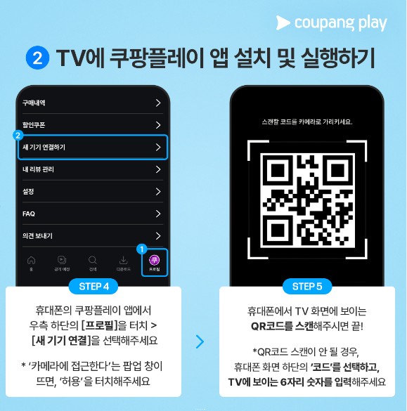 TV 화면에 QR 코드와 코드번호가 표기되 페이지가 보이면 휴대폰에서 쿠팡플레이 앱을 실행해주세요