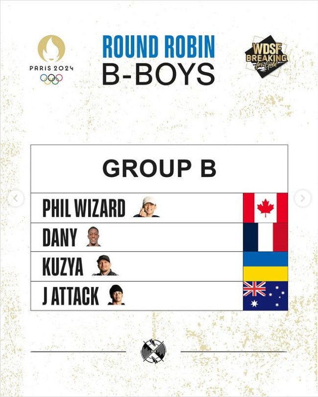 대한민국의 홍텐이 39세 최고령으로 파리올림픽 브레이킹 종목에 출전합니다. 8월 10일 비보이 본선을 앞두고 있는 라운드로빈 조편성과 대진표 알려드리려고 합니다. 홍텐 김홍열은 한국 브레이킹의 전설이기도 한데요. 올림픽 무대에서 멋진 피날레를 할 수 있길 바라며 아래 통해 중계 보시며 응원해주시길 바랍니다.