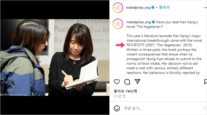 한편 노벨상 공식 인스타그램에는 한강 작가의 수상을 알리면서 이름과 대표작을 한글로 표기하고 있어 더욱더 관심을 모으고 있습니다.
