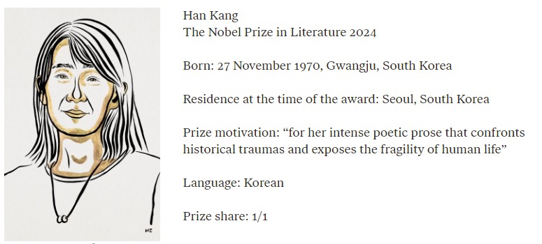 10월 10일 저녁 스웨덴 한림원이 발표한 2024 노벨 문학상 수상자로 한강이 선정되었습니다. 한강은 역사적 상처를 시적으로 직면하고 인간 삶의 연약함을 드러내는 작품들로 찬사를 받으며 이번 상을 수상하게 되었습니다.